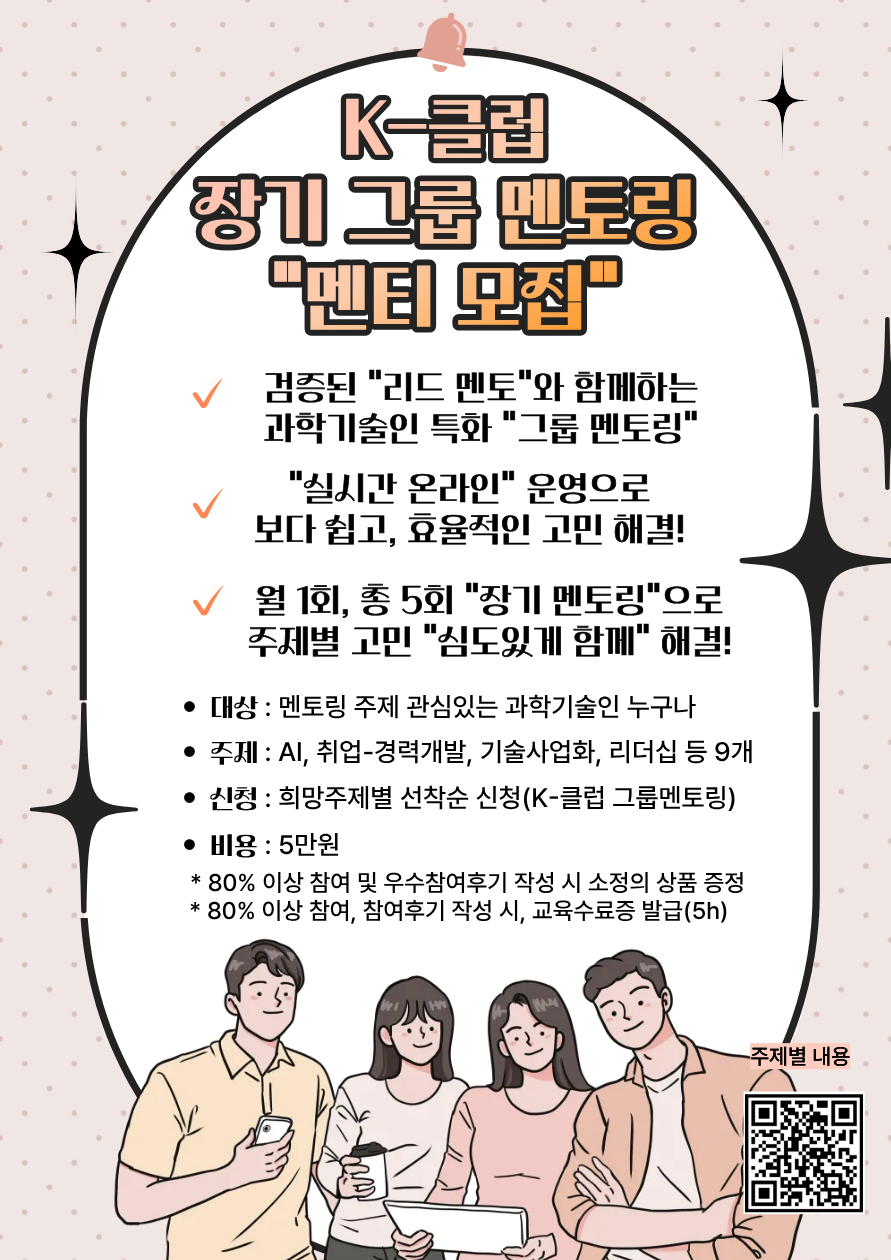[유관기관 홍보] K-클럽 과학기술인 장기 그룹 멘토링 참가자(멘티) 모집