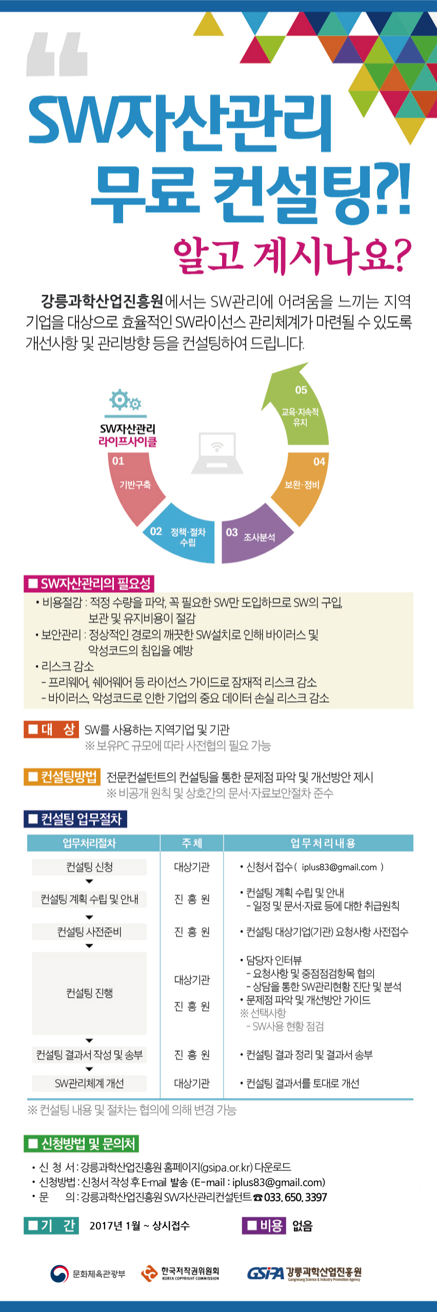 지역기업 및 기관을 대상으로 SW관리실태 진단 분석 및 문제점 파악, 개선방안을 제시하여 기업의 SW공정이용문화 정착과 올바른 SW관리체계 정립을 위하여 2017년 SW자산관리 컨설팅을 지원하오니, SW라이선스 분쟁 및 SW관리체계 구축이 필요한 기업에서는 많은 참여 바랍니다.